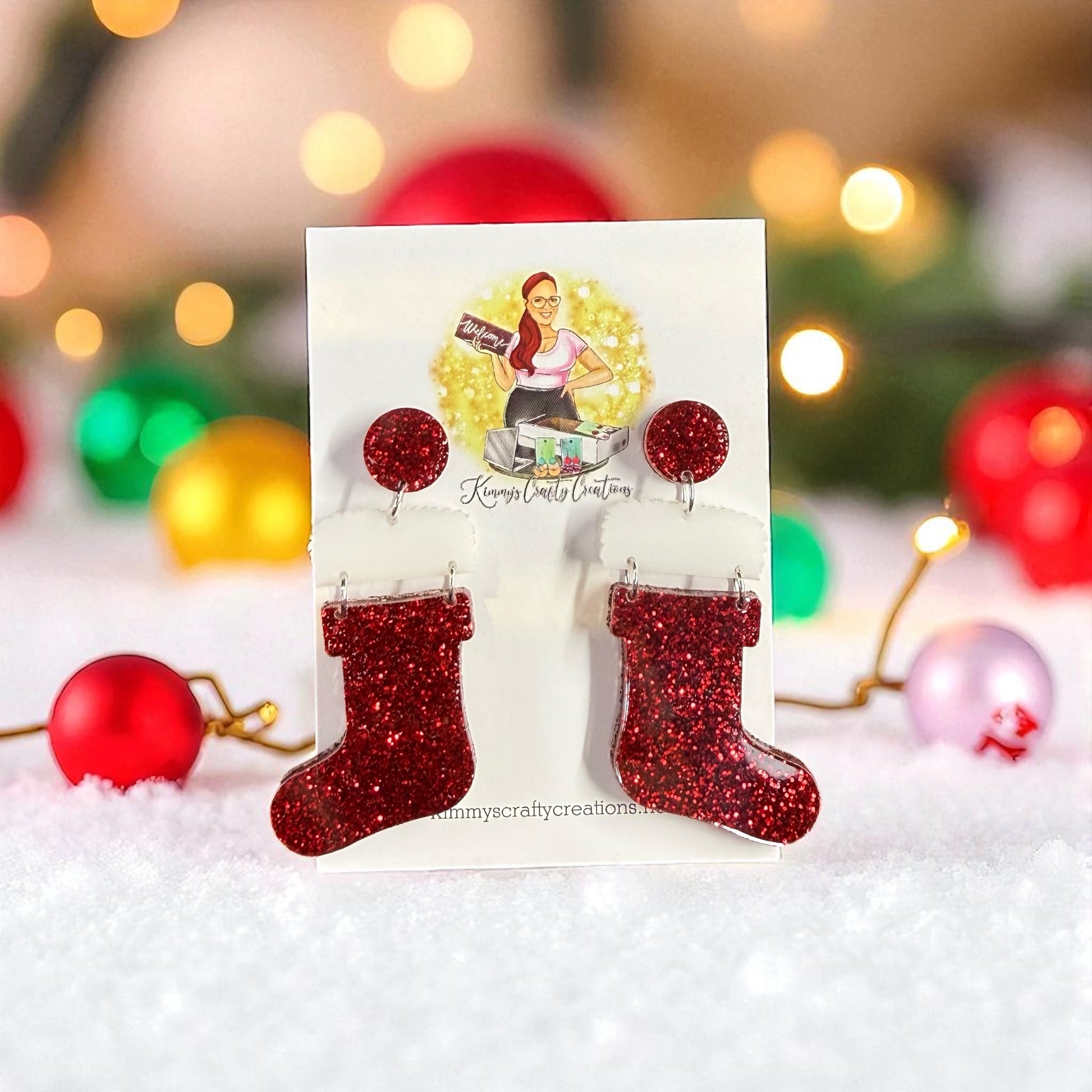 Add a sprinkle of holiday cheer with these playful Christmas Stockings Dangles! Crafted from bright white acrylic with sparkling red glitter accents, they’re lightweight and comfy thanks to hypoallergenic post hardware. Perfect for decking your ears out with festive fun all season long!