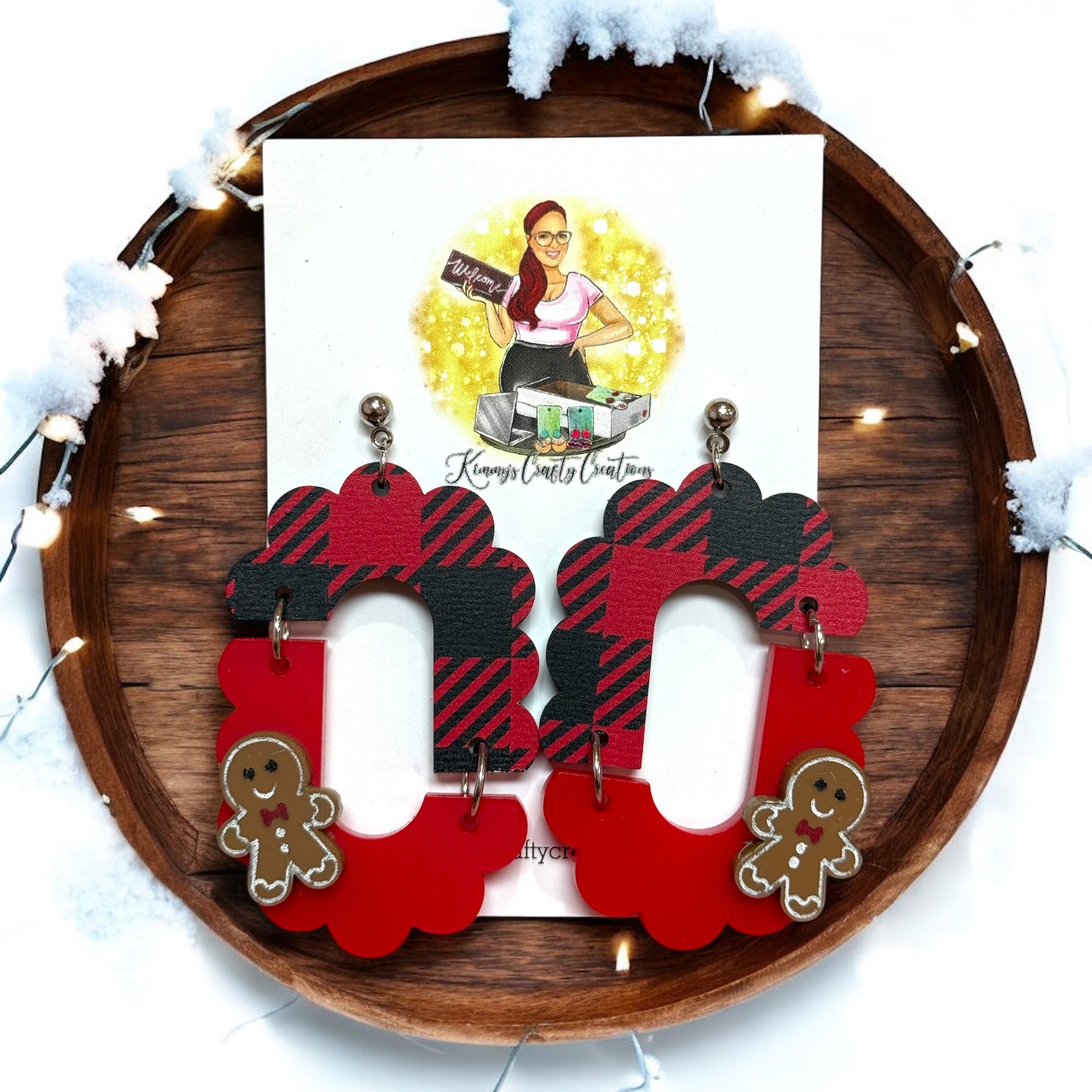 Expertly crafted for the holiday season, these Gingerbread Plaid Christmas Earrings bring a touch of festive cheer to any outfit. Laser cut from plaid and red acrylic, these unique earrings feature handpainted gingerbread accents and hypoallergenic hardware for comfortable wear. Add a boho flair to your Christmas look with these charming earrings.