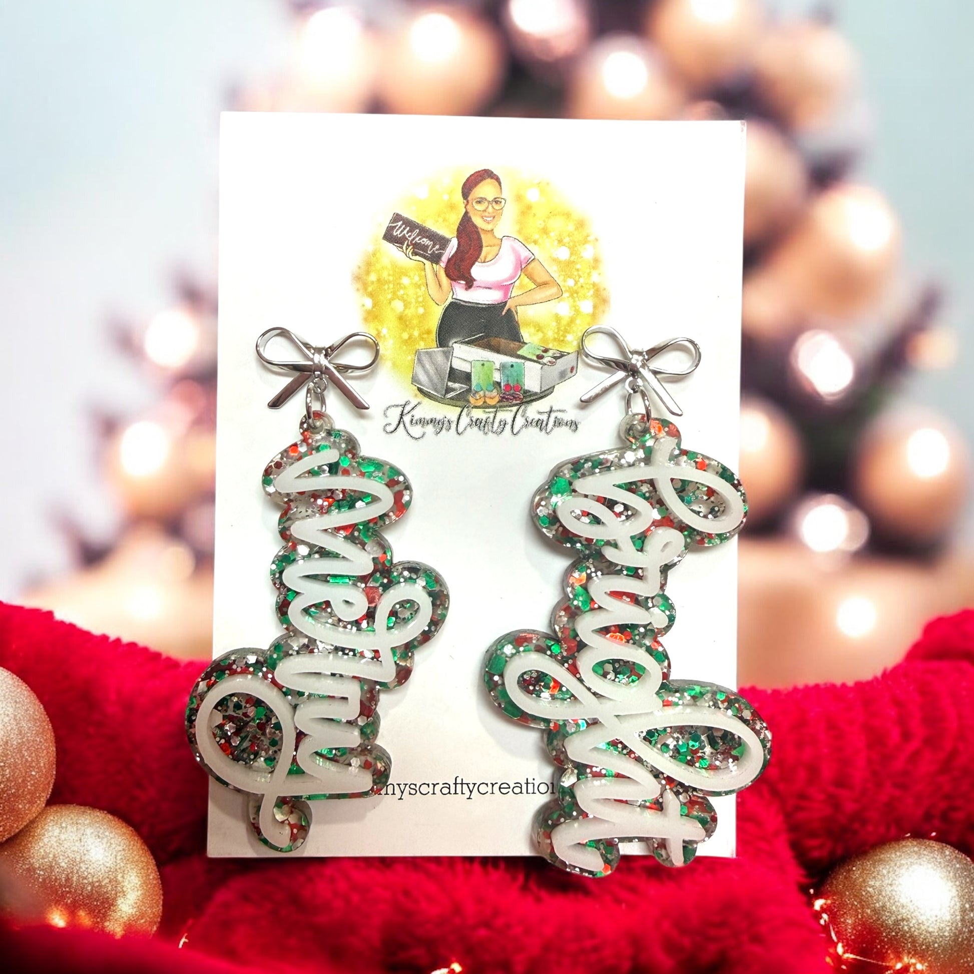 Add a touch of festive fun with our Merry And Bright Dangles! These laser cut acrylic earrings feature the phrase "Merry and Bright" in glitter for a shimmering finish. Hypoallergenic hardware ensures comfortable wear, and you can choose from Pom Pom, Bow connector, Ball Posts, or Fish wire hooks for your perfect style.